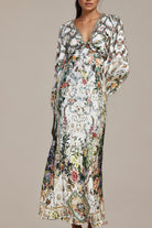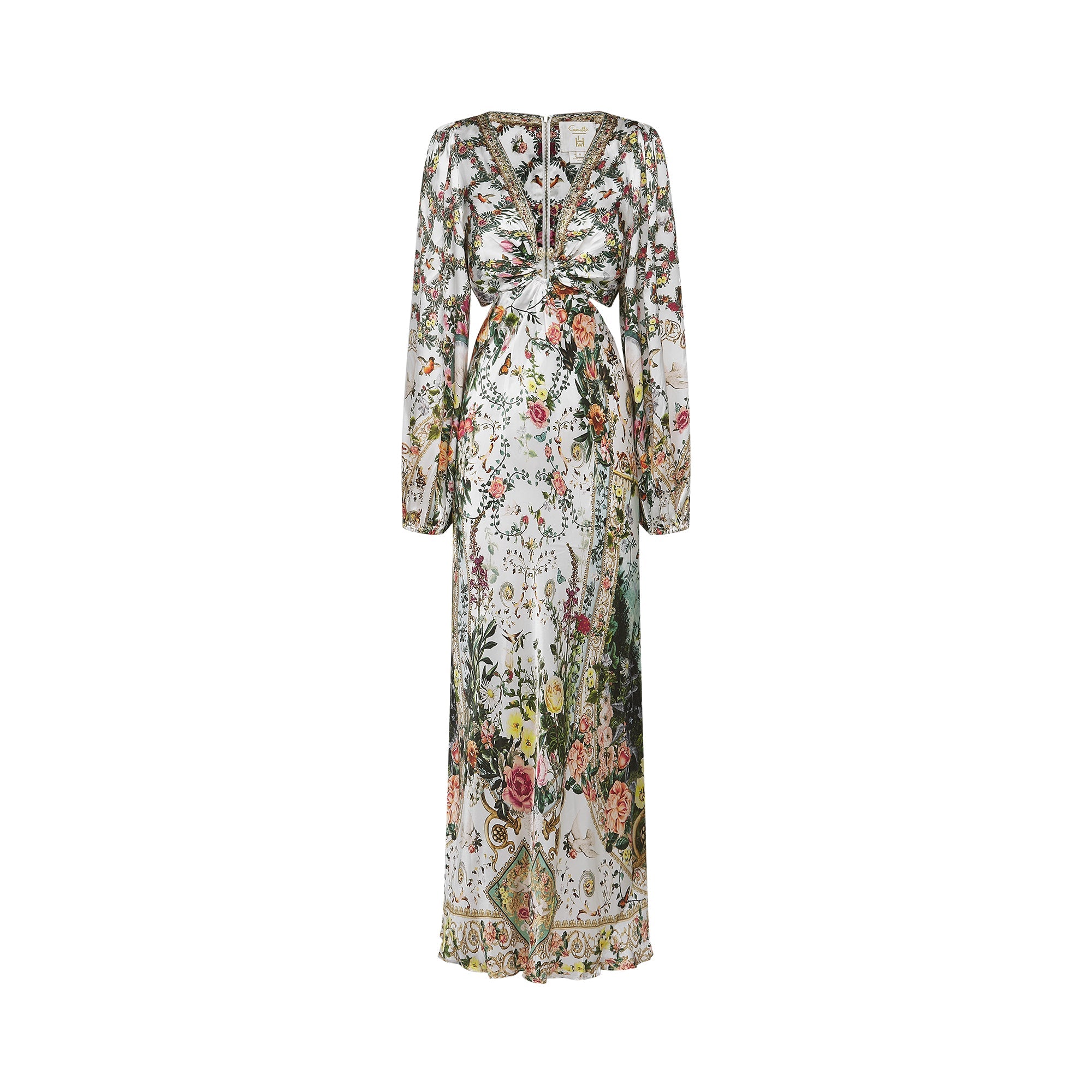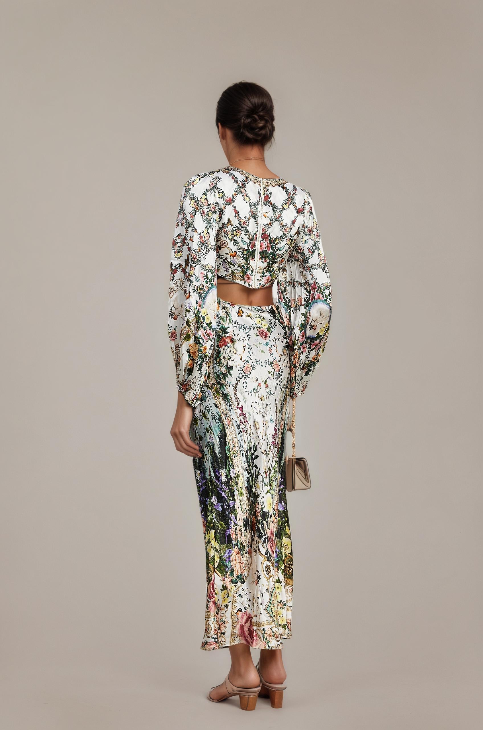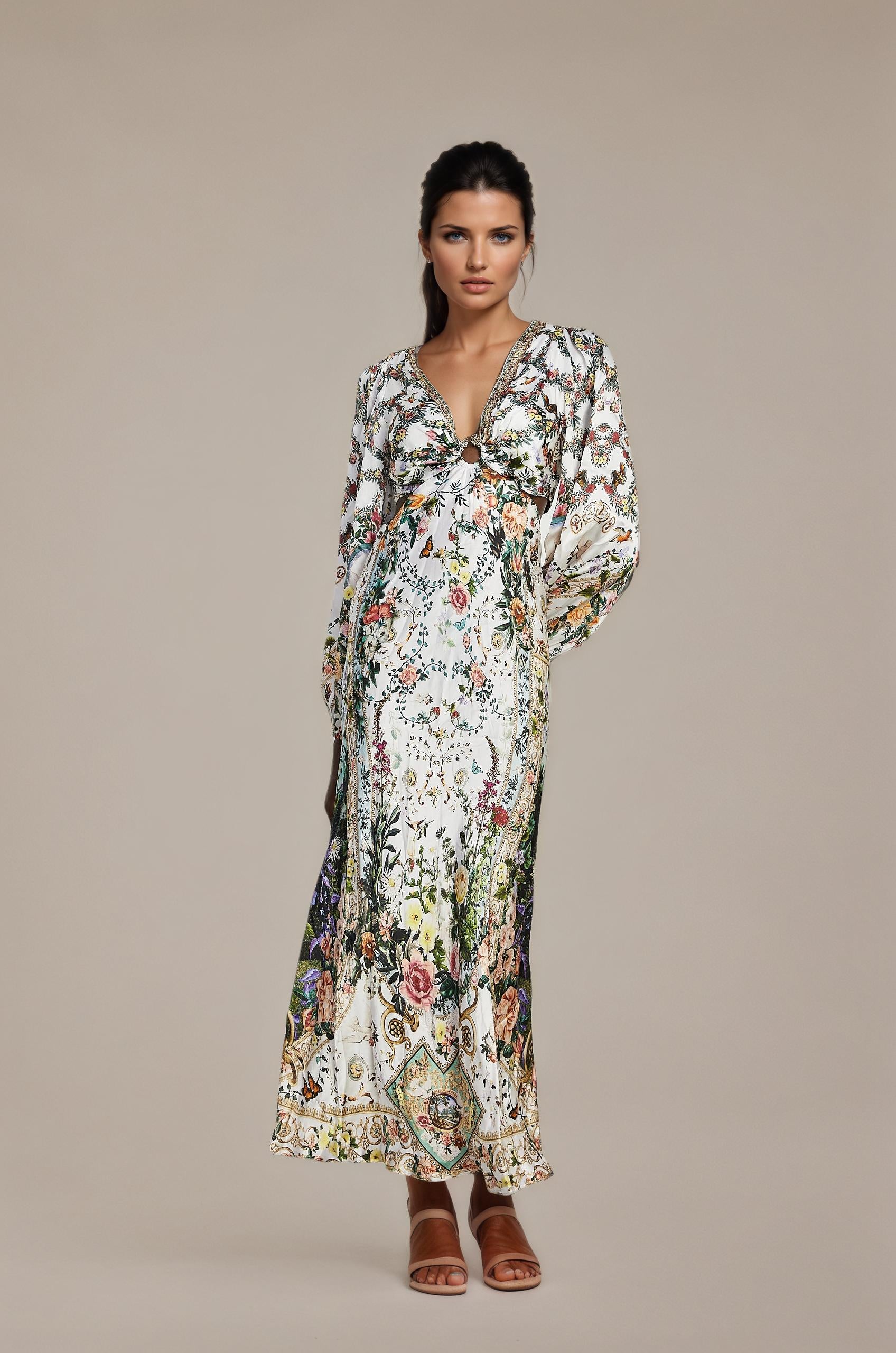 Introducing the Tallulah Maxi Dress With Crystal Embellishments, a must-have addition to your wardrobe. This dress features delicate crystal embellishments and an all-over floral print. With its plunging V-neck and elegant cut-out design, it offers a perfect fit. Elevate your style with this elegant and versatile piece.