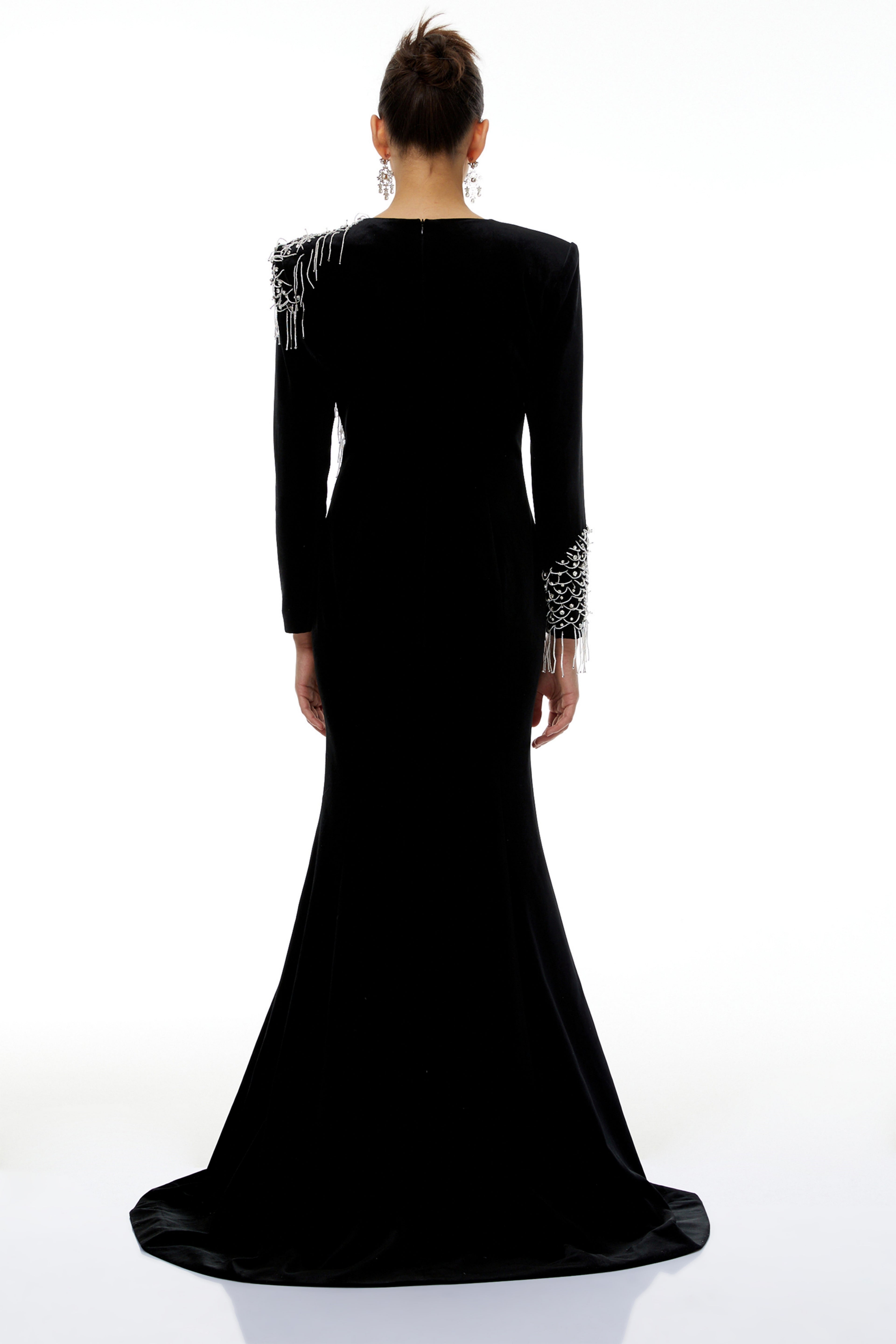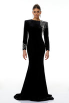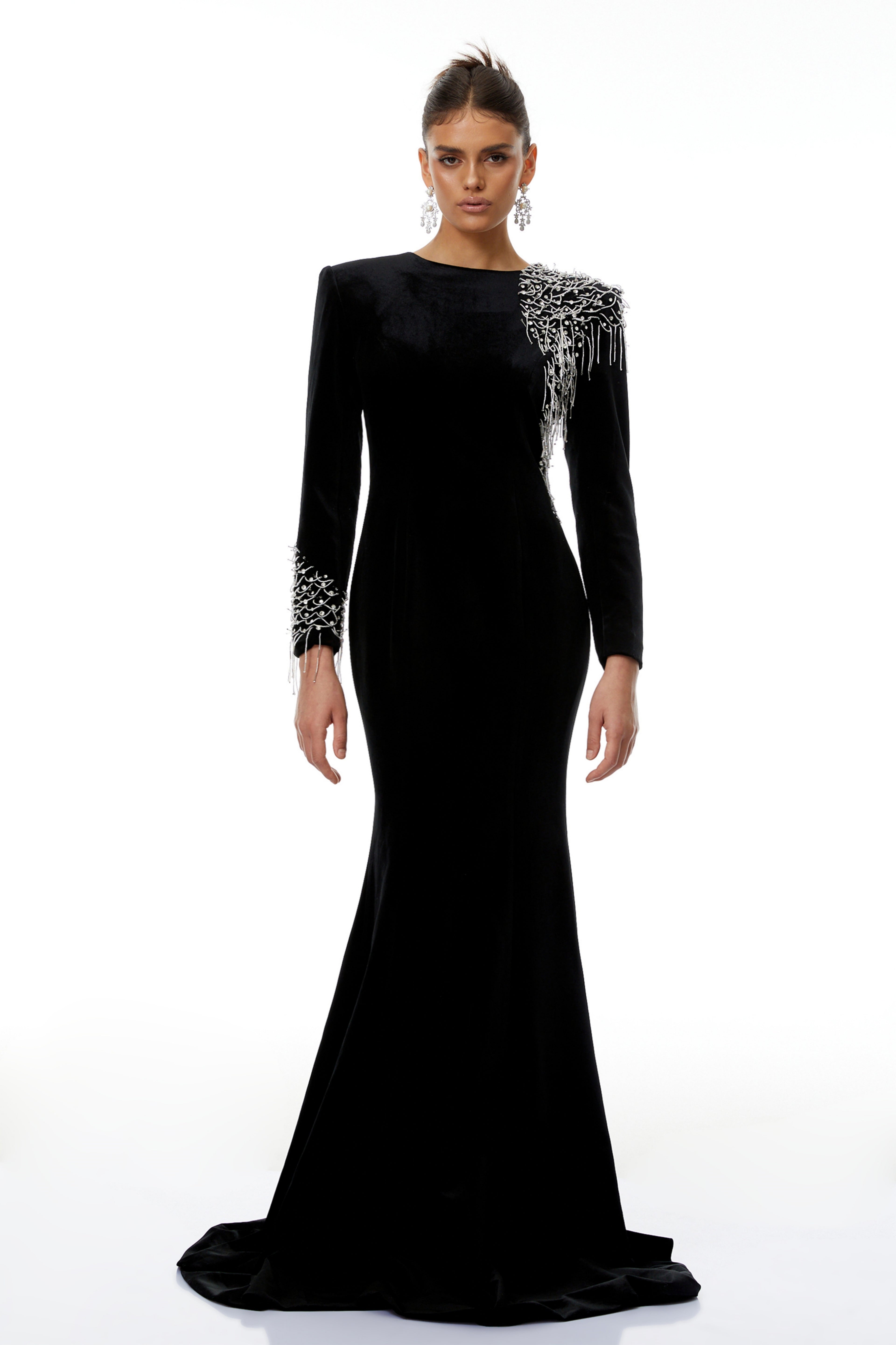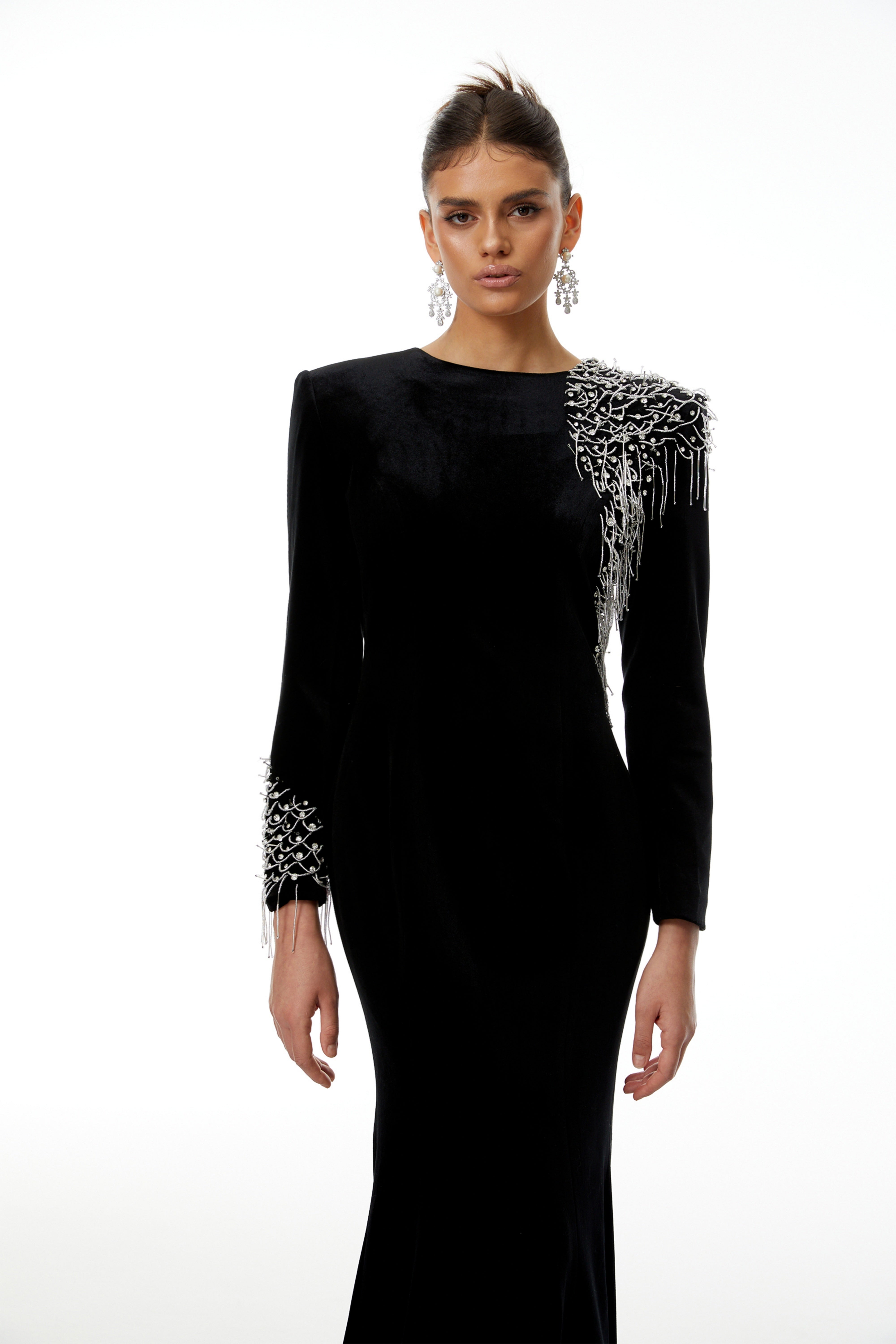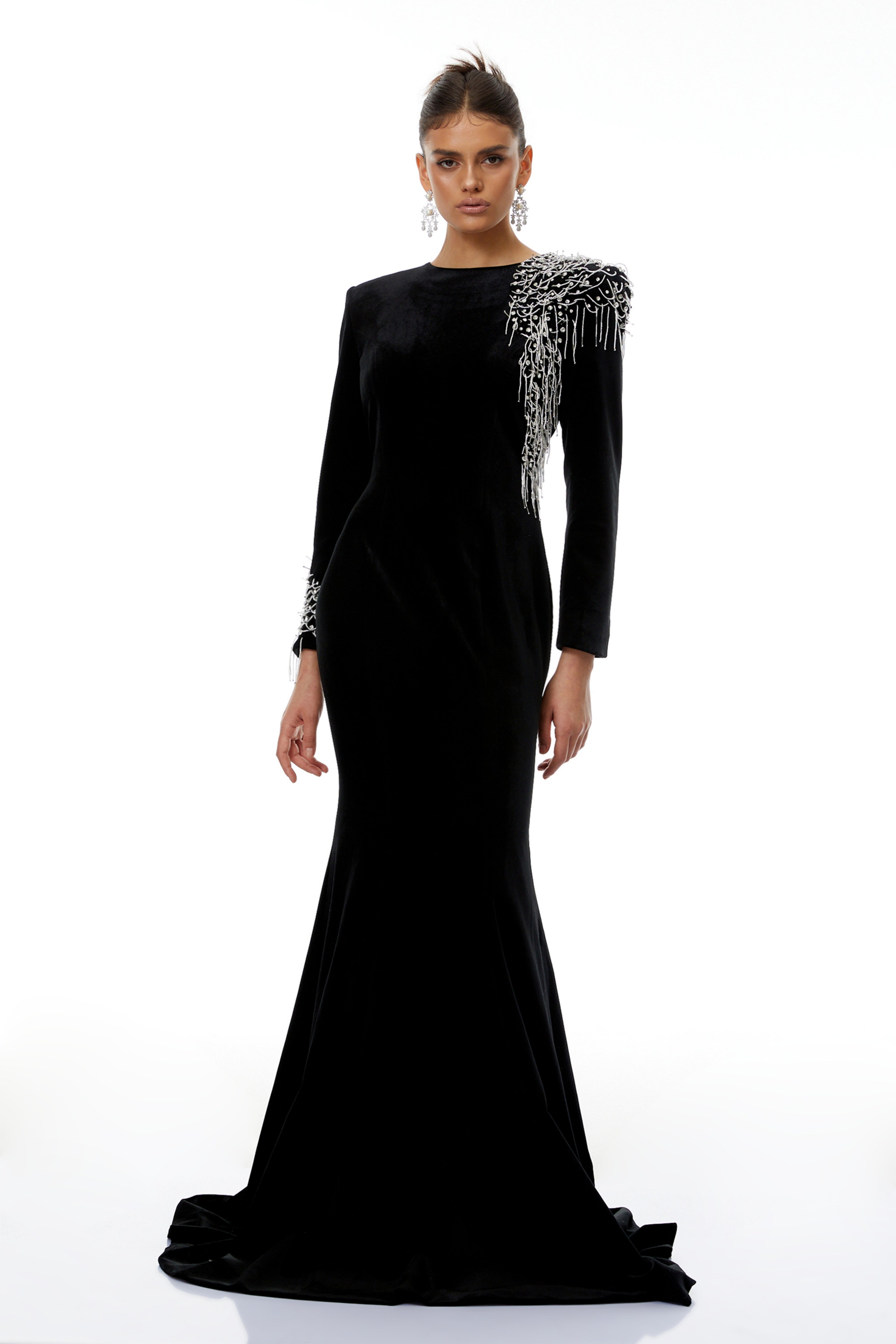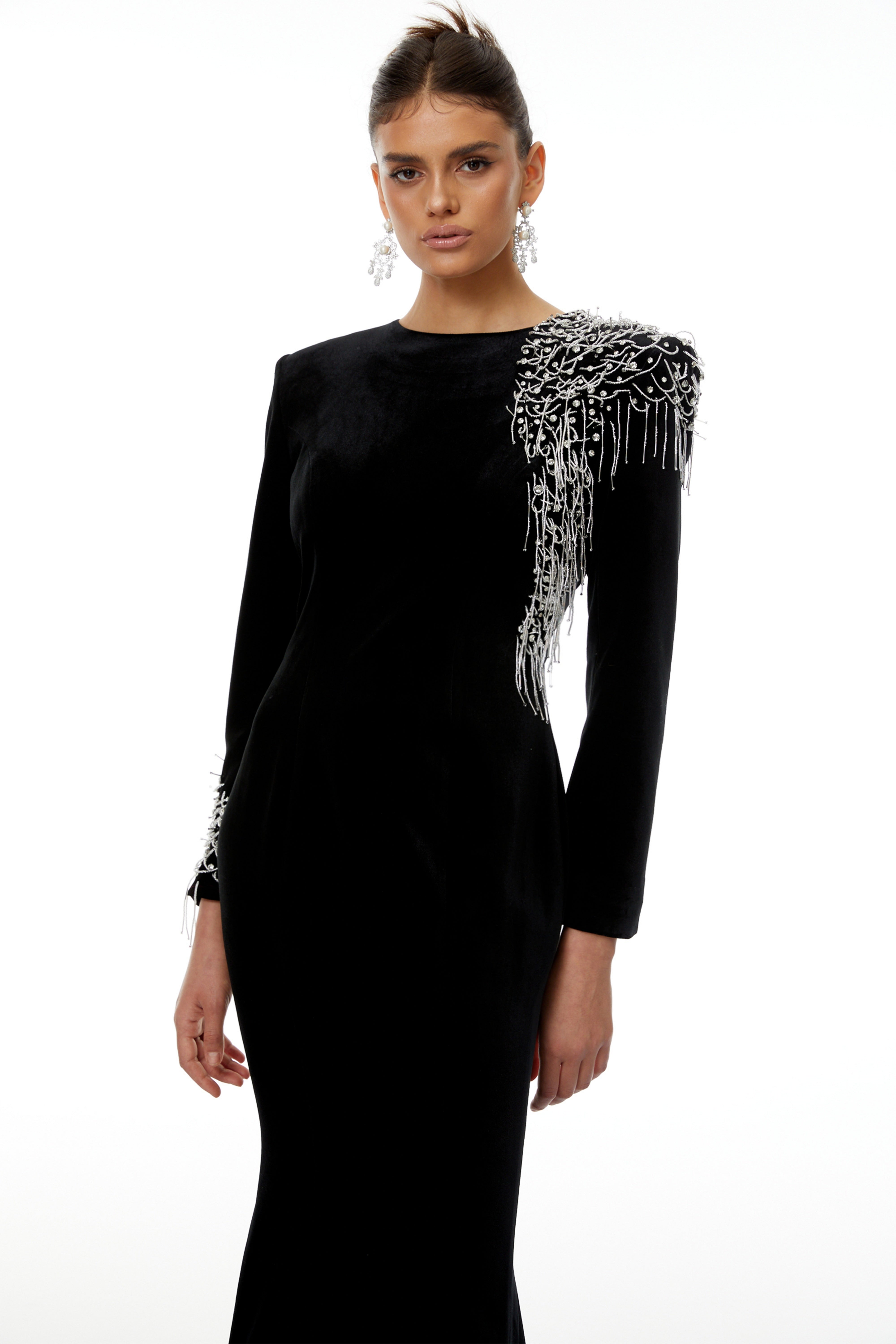 Introducing the Ursula Black Embellished Mermaid Maxi Dress, a must-have addition to your wardrobe. This dress features a captivating mermaid silhouette in a classic black hue, complete with a round neck and long sleeves. With its intricate bead and rhinestone embellishments, fitted waistline, and rear zip fastening, it offers a glamorous and flattering fit. Elevate your style with this dramatic maxi-length dress, finished with an elegant train design.